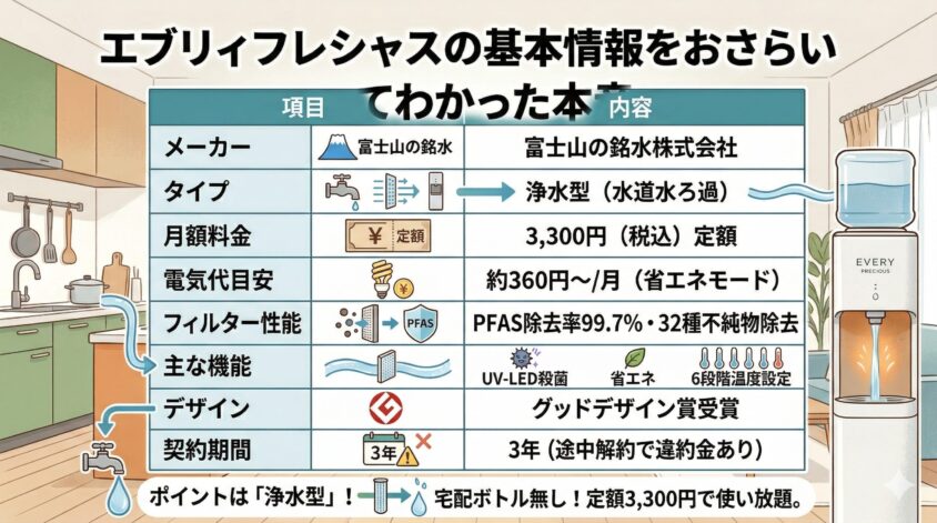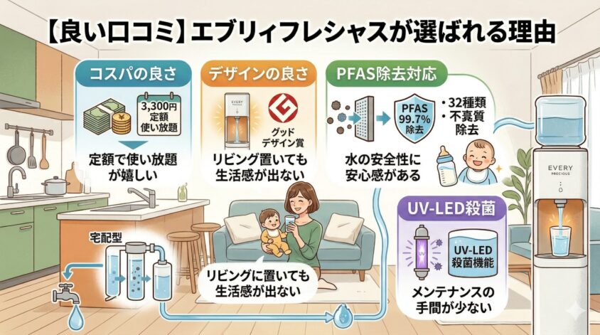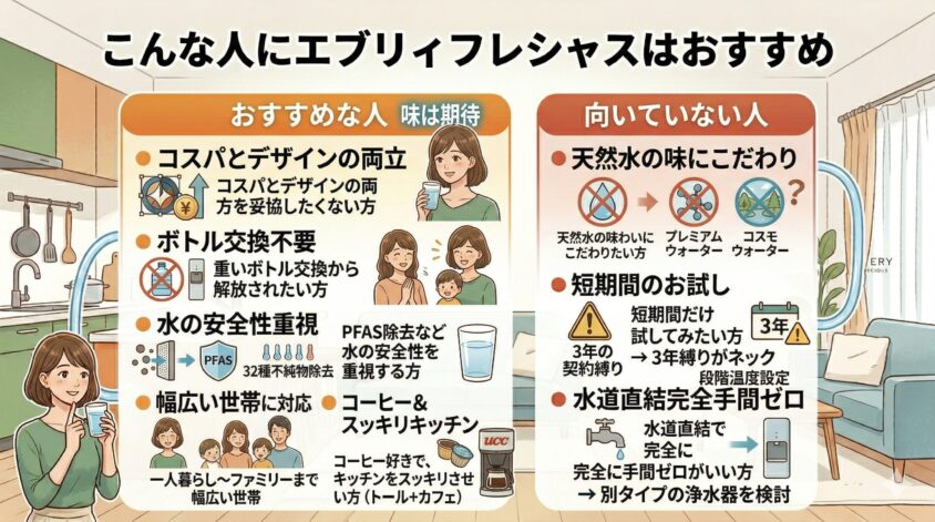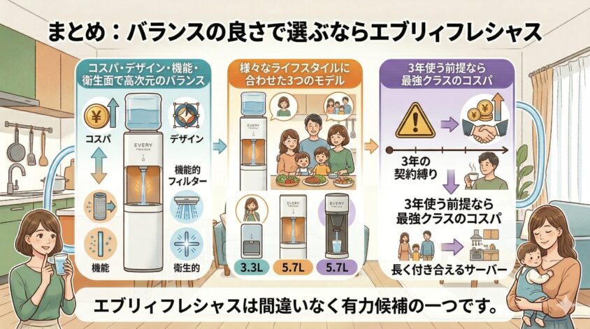 エブリィフレシャスは、コスパ・デザイン・機能・衛生面のどれをとっても高いレベルでバランスが取れた浄水型ウォーターサーバーです。「特にこだわりがないけど、失敗はしたくない」という方にとって、最も無難で確実な選択肢と言えるでしょう。