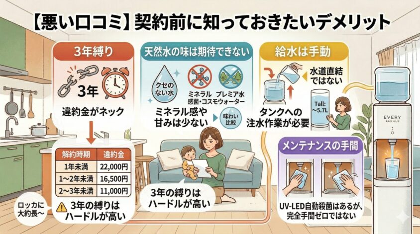 → 各社の解約金を一覧で比較したい方は「ウォーターサーバーの解約金・縛り期間まとめ」をどうぞ。