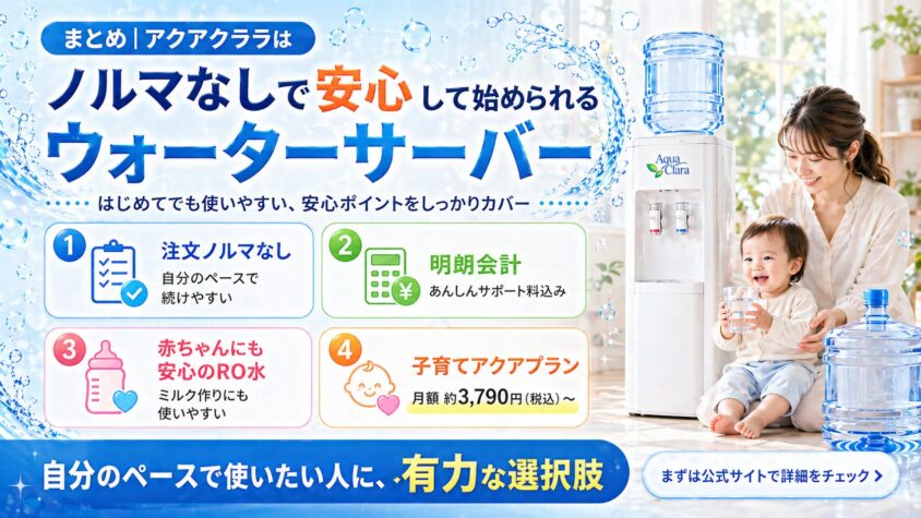 まとめ|アクアクララは「ノルマなしで安心して始められる」ウォーターサーバー
