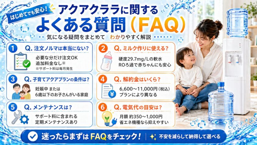 アクアクララは注文ノルマなしで自分のペースで利用でき、メンテナンスや故障対応が含まれた「あんしんサポート料」で追加の隠れコストがないのが特徴です。さらに、RO膜でろ過した安全な軟水は赤ちゃんのミルク作りにも適しており、子育て世帯に選ばれ続けています。