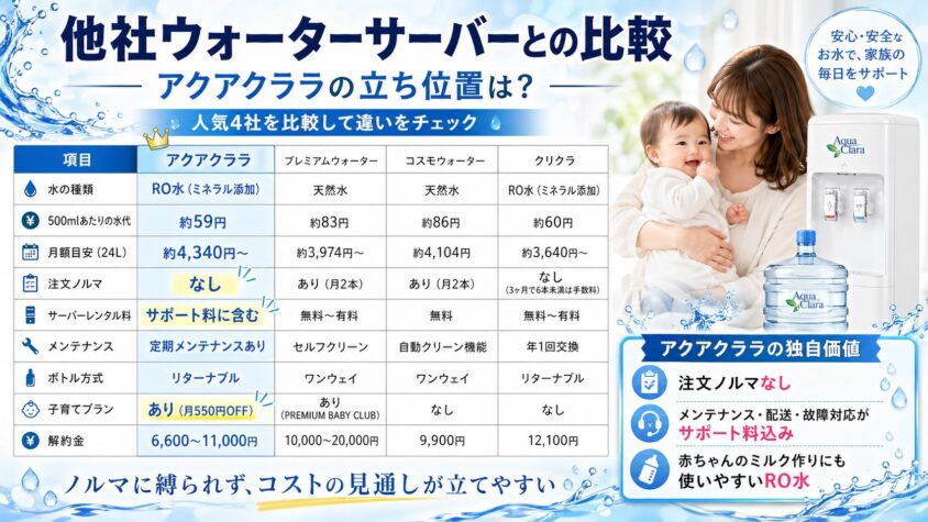 他社ウォーターサーバーとの比較|アクアクララの立ち位置は?
