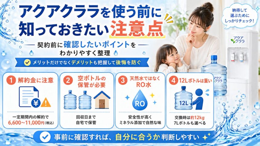 アクアクララを契約する前に、あらかじめ確認しておきたいポイントをまとめました。後悔しないために、メリットだけでなくデメリットも把握しておきましょう。
