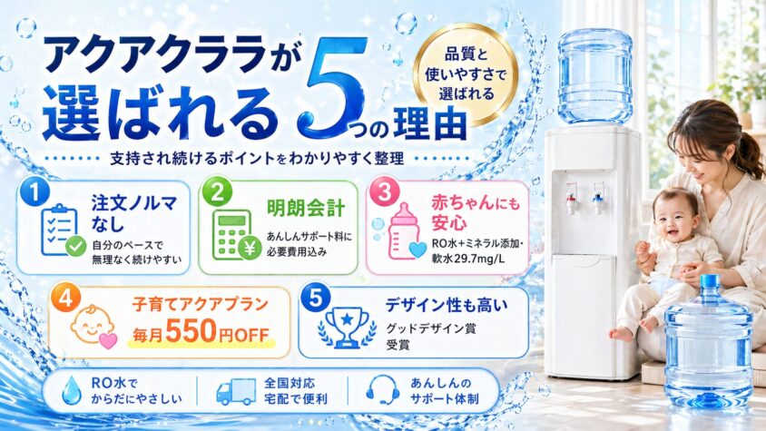 アクアクララは、注文ノルマなし・あんしんサポート料込みの明朗会計・赤ちゃんにも安心のRO水と、初めてウォーターサーバーを導入する方が感じがちな不安をしっかりカバーしてくれるサービスです。