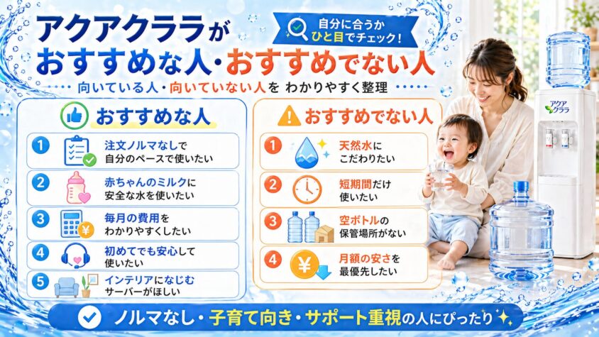 ここまでの内容をもとに、アクアクララが向いている方と、そうでない方を整理しました。