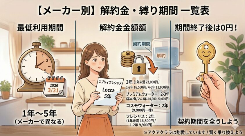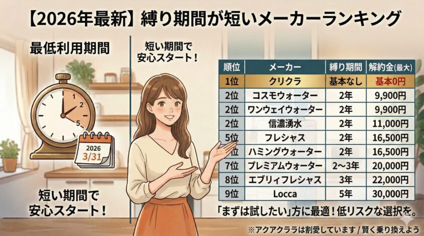 初めてウォーターサーバーを使う方や、「合わなかったら早めにやめたい」という方は、縛り期間が短いメーカーを選ぶのが安全です。