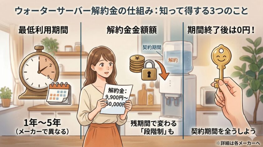 ウォーターサーバーの契約には、ほとんどの場合「最低利用期間」が設定されています。この期間内に解約すると、違約金(解約金)が発生します。