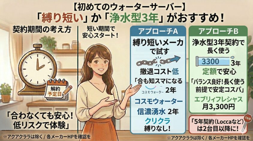 アプローチA:縛りが短いメーカーで試す コスモウォーター(2年)、信濃湧水(2年)、クリクラ(縛りなし)など、最低利用期間が短いメーカーでまずは体験。合わなければ比較的少ないコストで撤退できます。