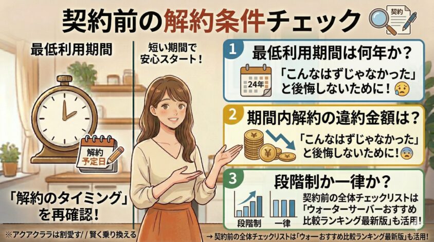 → 契約前のチェックリスト全体は「ウォーターサーバーおすすめ比較ランキング最新版」の最終チェックリストも活用してください。