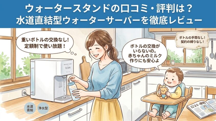 「ウォーターサーバーを使ってみたいけど、ボトルの交換が面倒そう」「赤ちゃんのミルク作りに安全な水を手軽に使いたい」「契約の縛りがあると不安で踏み切れない」——そんなお悩みを抱えていませんか。 ウォータースタンドは、水道に直結して使う浄水型ウ...