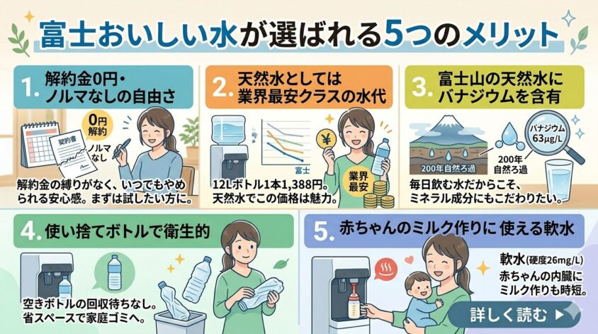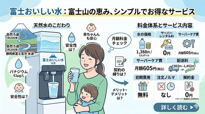 富士おいしい水は、「天然水のウォーターサーバーを気軽に試してみたい」という方にぴったりのサービスです。注文ノルマなし、解約金0円という条件は業界でも珍しく、初めてのウォーターサーバー選びで失敗したくない方にとって安心材料になります。