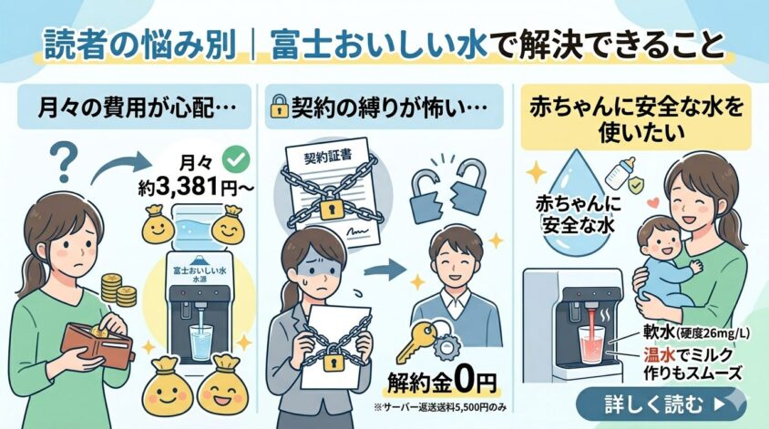 ウォーターサーバーの導入を迷う理由は人それぞれです。ここでは、よくある悩み別に富士おいしい水がどう応えてくれるのかを整理しました。
