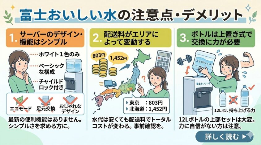 デザインや機能を重視するなら他社も選択肢に入りますが、「コスト」と「縛りのなさ」を優先するなら富士おいしい水は有力な候補ですね。