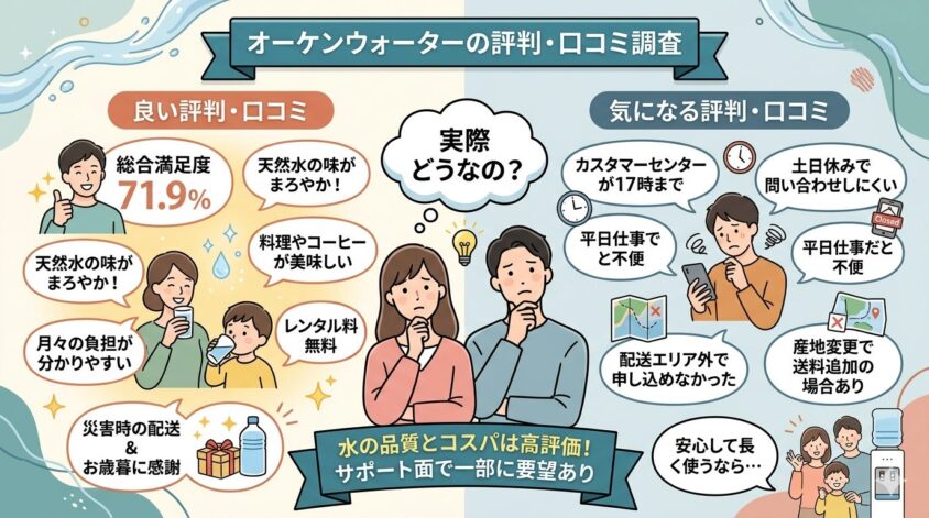 オーケンウォーターの利用者からは、水のおいしさとサポート対応を評価する声が多く見られます。独自調査による総合満足度は71.9%と高い水準です。