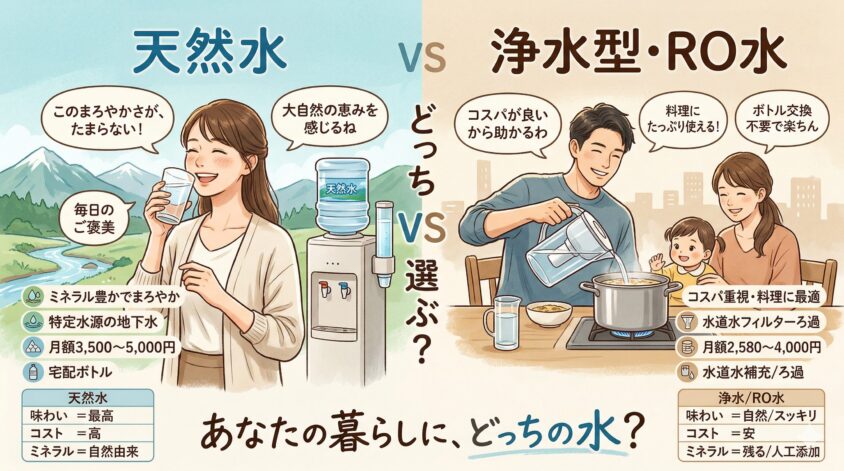一方で、「水は味よりコスパ」「料理にたっぷり使いたい」「ボトル交換が面倒」という方には浄水型の方が合っています。天然水を選ぶなら、コスト増とボトル管理の手間を受け入れる覚悟が必要です。