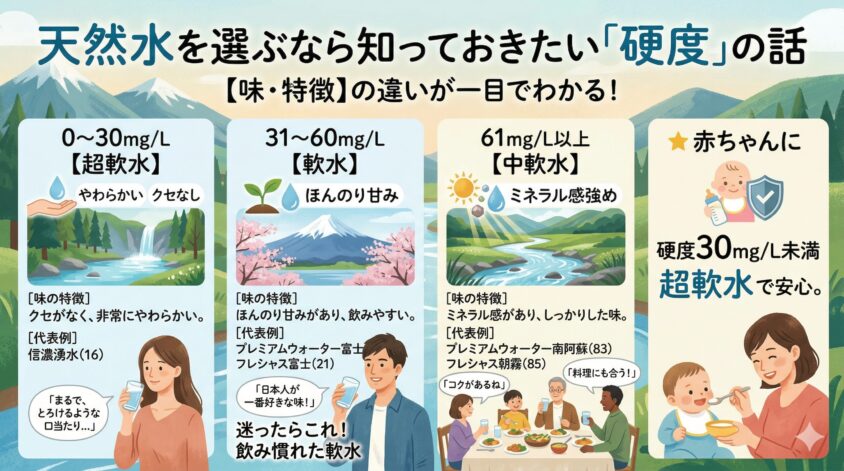 日本人が飲み慣れているのは軟水なので、迷ったら硬度30〜60mg/Lを選ぶと無難。赤ちゃんのミルクに使うなら30mg/L未満が安心です。
