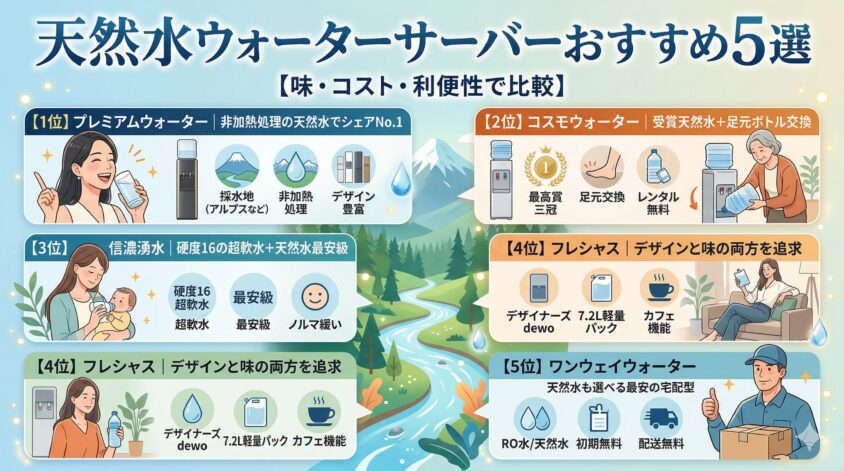 バランスで選ぶならプレミアムウォーター、ボトル交換の楽さならコスモウォーター、コスパならなら信濃湧水。あなたの優先順位に合った天然水サーバーを見つけてください。