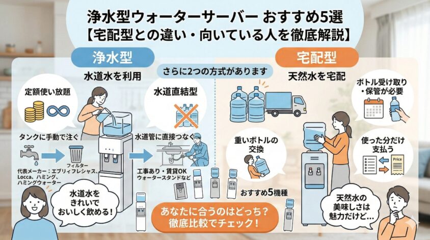 → 浄水型も宅配型もまとめて比較したい方は「ウォーターサーバーおすすめ比較ランキング最新版」が便利です。