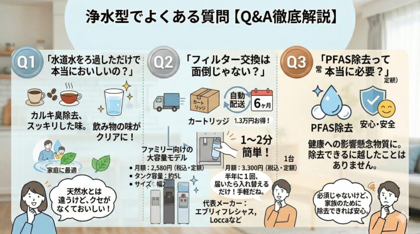 浄水型ウォーターサーバーは、コスパ・手軽さ・省スペースのすべてで宅配型を上回ります。「天然水の味にこだわりたい」という明確な理由がない限り、2026年は浄水型を第一候補にして良い時代です。