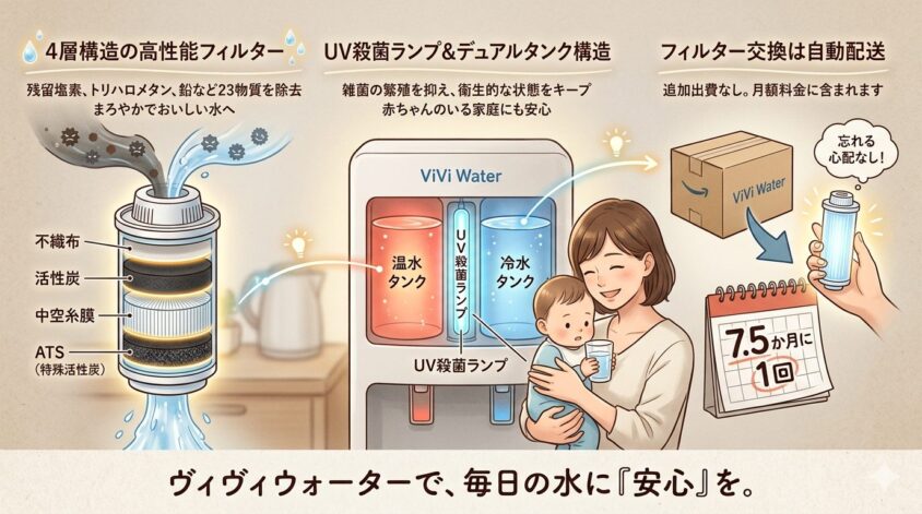 A. はい。ヴィヴィウォーターは4層フィルターで23物質を除去し、UV殺菌も搭載しています。弱温水モード(約70〜75℃)を使えば、調乳に適した温度のお湯をすぐに用意できます。