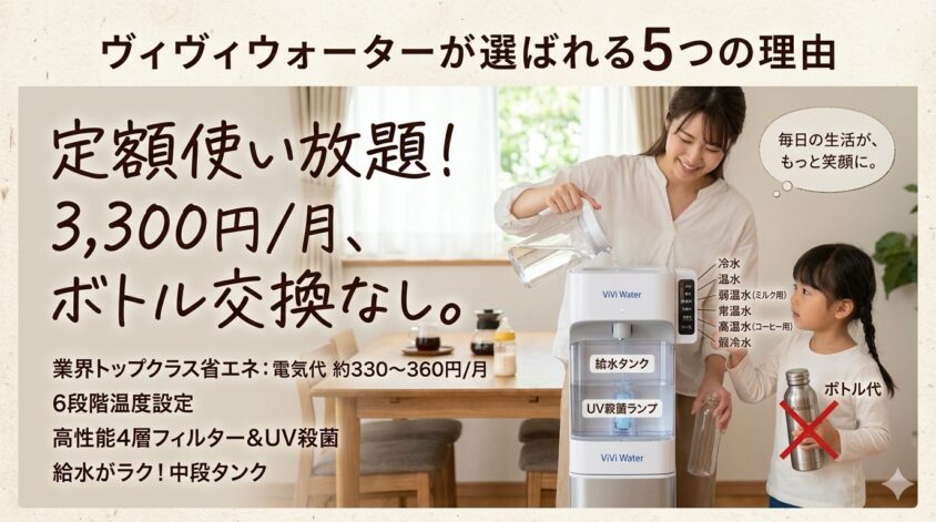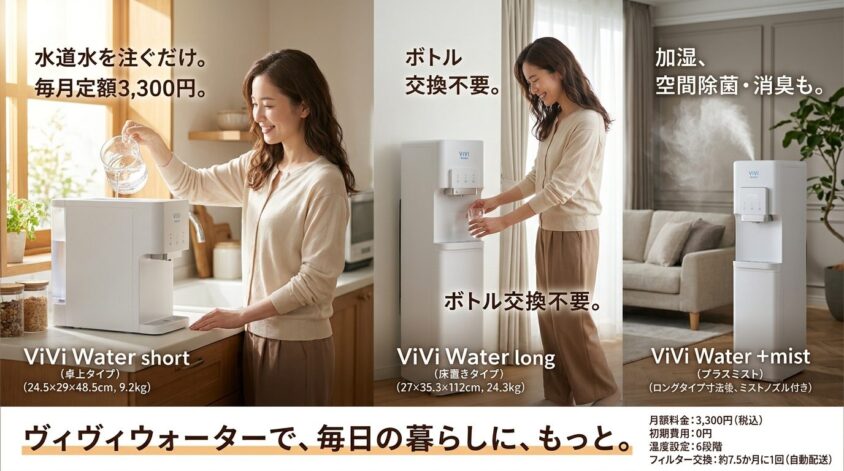 近年、水道水を浄水して使う「浄水型ウォーターサーバー」が注目されています。なかでもViVi Water(ヴィヴィウォーター)は、定額3,300円(税込)で使い放題という手軽さと、6段階の温度調節や高性能フィルターが話題のサーバーです。