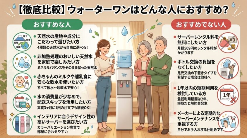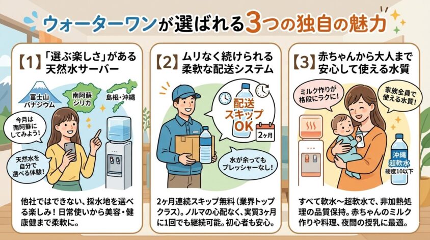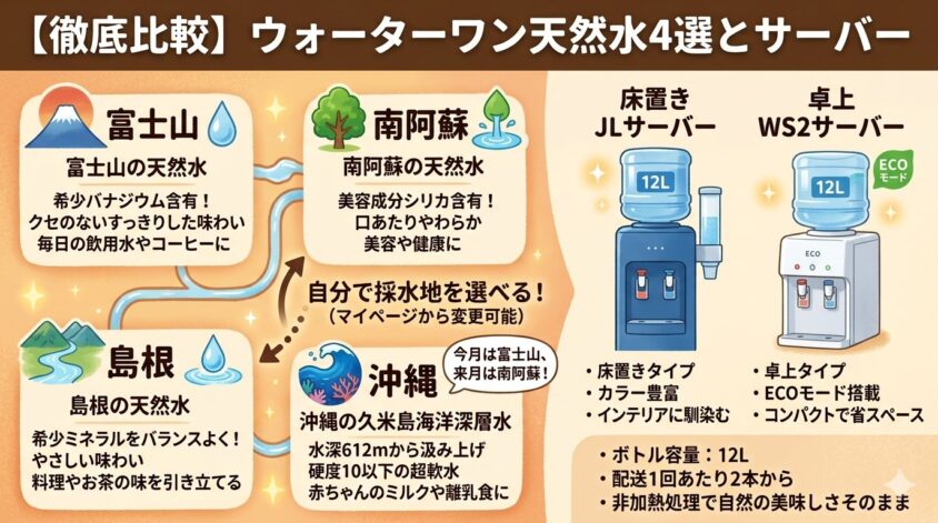 比較してみると、水の種類を自分で選べるのはウォーターワンならではの強みだね。