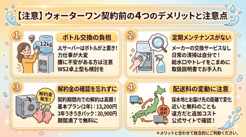 どんなサービスにもメリットとデメリットがあります。ウォーターワンを検討する際に事前に把握しておきたいポイントを正直にまとめました。