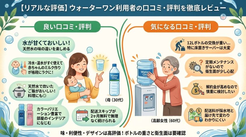 実際にウォーターワンを利用している方のリアルな声を集めました。良い口コミと気になる口コミの両方を確認して、バランスよく判断材料にしてください。