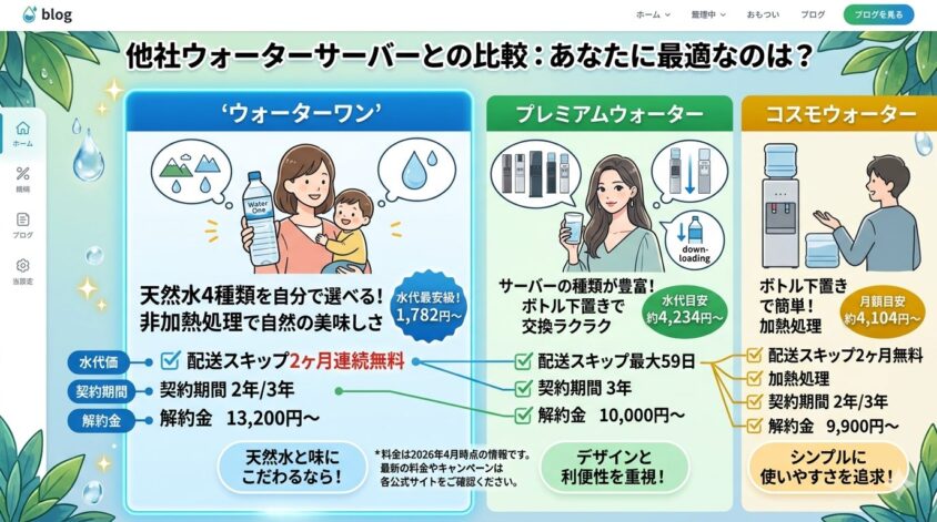 ウォーターワンと人気の他社サーバーを比較してみましょう。サービスごとに得意とする部分が異なるため、ご自身のライフスタイルや重視するポイントに合わせて選ぶことが大切です。