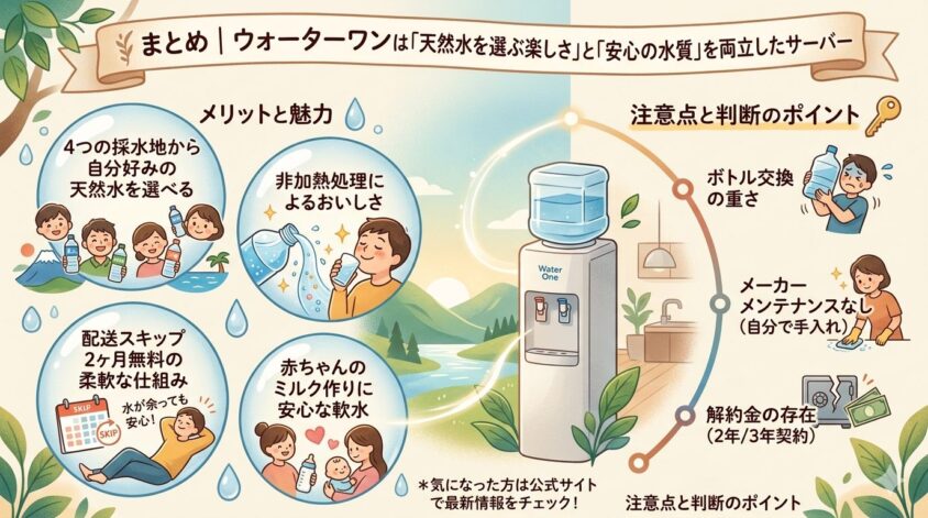 まとめ|ウォーターワンは「天然水を選ぶ楽しさ」と「安心の水質」を両立したサーバー