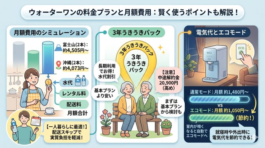 3年うきうきパックは、長期利用を前提にしたお得な料金プランです。基本プラン(2年)よりも水代が割引になるため、「長く使い続ける予定」という方にはおすすめです。ただし、契約期間内の解約金は20,900円(税込)と高めに設定されているため、まずは基本プランで試してから切り替えを検討するのも一つの方法です。